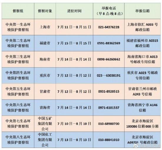 进驻期间,各督察组将分别设立联系电话和邮政信箱,受理被督察对象生态环境?;し矫娴睦葱爬吹缇俦?。具体举报方式如下表: